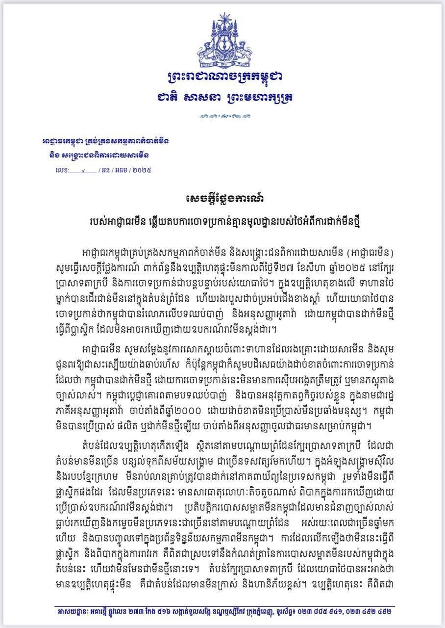 អាជ្ញាធរមីន សូមសម្តែងនូវការសោកស្តាយចំពោះទាហានដែលរងគ្រោះដោយសារមីន និងសូម ជូនពរឱ្យជាសះស្បើយយ៉ាងឆាប់រហ័ស ក៏ប៉ុន្តែកម្ពុជាក៏សូមបដិសេធយ៉ាងដាច់ខាតចំពោះការចោទប្រកាន់ ដែលថា កម្ពុជាបានដាក់មិនថ្មី ដោយការចោទប្រកាន់នេះមិនមានការស៊ើបអង្កេតត្រឹមត្រូវ ឬមានភស្តុតាង ច្បាស់លាស់។ កម្ពុជាប្តេជ្ញាគោរពតាមបទឈប់បាញ់ និងបានអនុវត្តកាតព្វកិច្ចរបស់ខ្លួន ក្នុងនាមជារដ្ឋ ភាគីអនុសញ្ញាអូតាវ៉ា ចាប់តាំងពីឆ្នាំ២០០០ ដោយដាច់ខាតមិនប្រើប្រាស់មីនប្រឆាំងមនុស្ស។ កម្ពុជា មិនបានប្រើប្រាស់ ផលិត ឬដាក់មីនថ្មីឡើយ ចាប់តាំងពីអនុសញ្ញាចូលជាធរមានសម្រាប់កម្ពុជា។