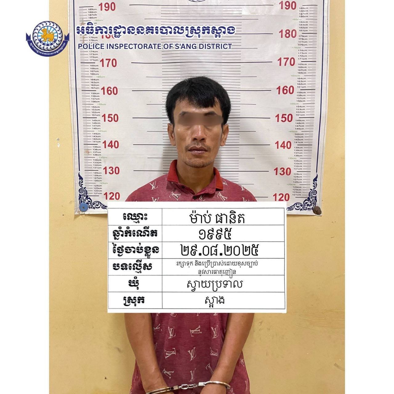 ៣-ឈ្មោះម៉ាប់ ផានិត ភេទប្រុសអាយុ ៣០ឆ្នាំជនជាតិខ្មែរមុខរបរមិនពិតប្រាកដមានទីលំនៅភូមិឫស្សីជ្រោយ ឃុំស្វាយប្រទាល ស្រុកស្អាង វិជ្ជាមានមានសារធាតុញៀនក្នុងទឹកនោម (+)ត្រូវបានឃាត់ខ្លួន។