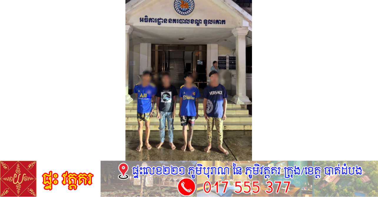 ភ្នំពេញ ៖ អនុវត្តតាមបទបញ្ជាផ្ទាល់ពីលោក ឧត្តមសេនីយ៍ឯក ជូន ណារិន្ទ អគ្គស្នងការរងនិងជាស្នងការនគរបាលរាជធានីភ្នំពេញ នៅថ្ងៃទី៣ ខែកញ្ញា  ឆ្នាំ២០២៥ វេលាម៉ោងប្រហែល២១:០០នាទី កម្លាំងផ្នែកជំនាញ នៃអធិការដ្ឋាននគរបាលខណ្ឌទួលគោក បានធ្វើការស្រាវជ្រាវឃាត់ខ្លួនជនសង្ស័យ០៤នាក់ជាបន្តបន្ទាប់ពីបទហិង្សាដោយចេតនាមានស្ថានទម្ងន់ទោស(ប្រើមួកការពារសុវត្ថិភាពនិងប្រើដៃ, ជើងវាយនិងធាក់លើជនរងគ្រោះ០២នាក់បណ្ដាលឲ្យរងរបួសក្បាលនិងដងខ្លួន) ឃាត់ខ្លួននៅចំណុចផ្លូវរថភ្លើង ក្រុមទី១០៩ ភូមិ២៣ សង្កាត់បឹងកក់ទី២ ខណ្ឌទួលគោក រាជធានីភ្នំពេញ ដែលបានប្រព្រឹត្តបទល្មើសនៅចំណុចលើដងផ្លូវលេខ៦០៨ ក្រុមទី១០៩ ភូមិ២៣ សង្កាត់បឹងកក់ទី២ ខណ្ឌទួលគោក កាលពីវេលាម៉ោងប្រហែល១៩:៣៦នាទីថ្ងៃដដែល ។