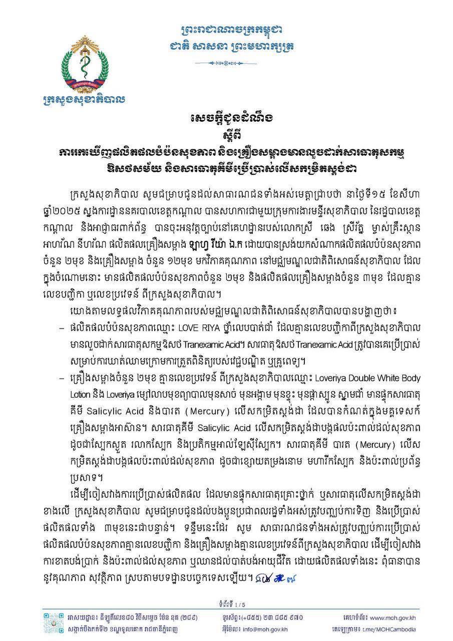-គ្រឿងសម្អាងចំនួន ២មុខ គ្មានលេខប្រវេទន៍ ពីក្រសួងសុខាភិបាលឈ្មោះ Loveriya Double White Body Lotion និង Loveriya ម្សៅលាបមុខព្យាបាលមុនសាច់ មុនអង្កាម មុនខ្ទុះ មុនផ្កាស្បូន ស្នាមជាំ មានផ្ទុកសារធាតុ គីមី Salicylic Acid និងបារត (Mercury) លើសកម្រិតស្តង់ដា ដែលបានកំណត់ក្នុងមគ្គទេស គ្រឿងសម្អាងអាស៊ាន។ សារធាតុគីមី Salicylic Acid លើសកម្រិតស្តង់ដាបង្កផលប៉ះពាល់ដល់សុខភាព ដូចជាស្បែកស្ងួត រលាកស្បែក និងប្រតិកម្មអាល់ឡែស៊ីស្បែក។ សារធាតុគីមី បារត (Mercury) លើស កម្រិតស្តង់ដាបង្កផលប៉ះពាល់ដល់សុខភាព ដូចជាខ្សោយតម្រងនោម មហារីកស្បែក និងប៉ះពាល់ប្រព័ន្ធ ប្រសាទ។