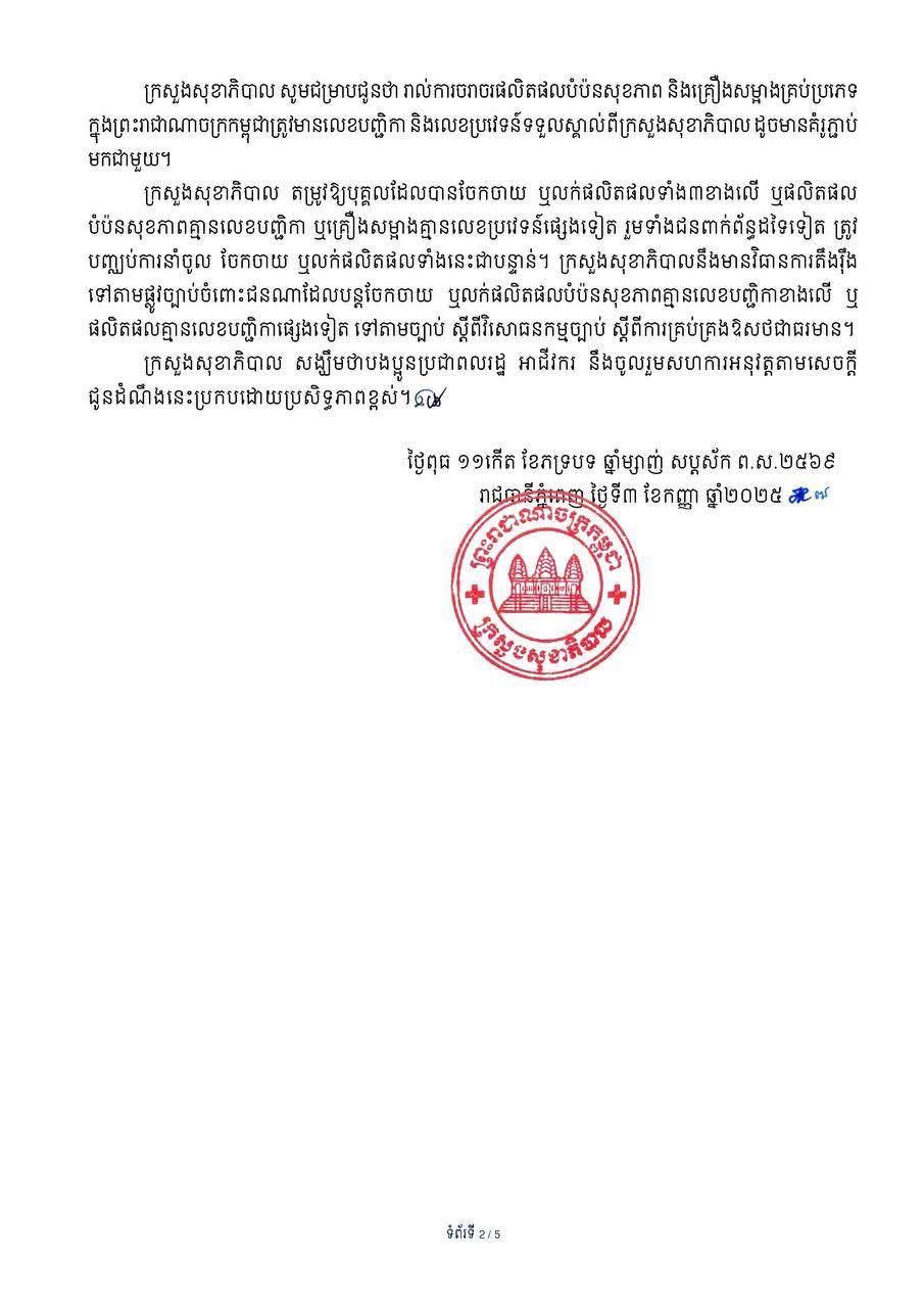 ក្រសួងសុខាភិបាល សូមជម្រាបជូនថា រាល់ការចរាចរផលិតផលបំប៉នសុខភាព និងគ្រឿងសម្អាងគ្រប់ប្រភេទ ក្នុងព្រះរាជាណាចក្រកម្ពុជាត្រូវមានលេខបញ្ចិកា និងលេខប្រវេទន៍ទទួលស្គាល់ពីក្រសួងសុខាភិបាល ដូចមានគំរូភ្ជាប់ មកជាមួយ។