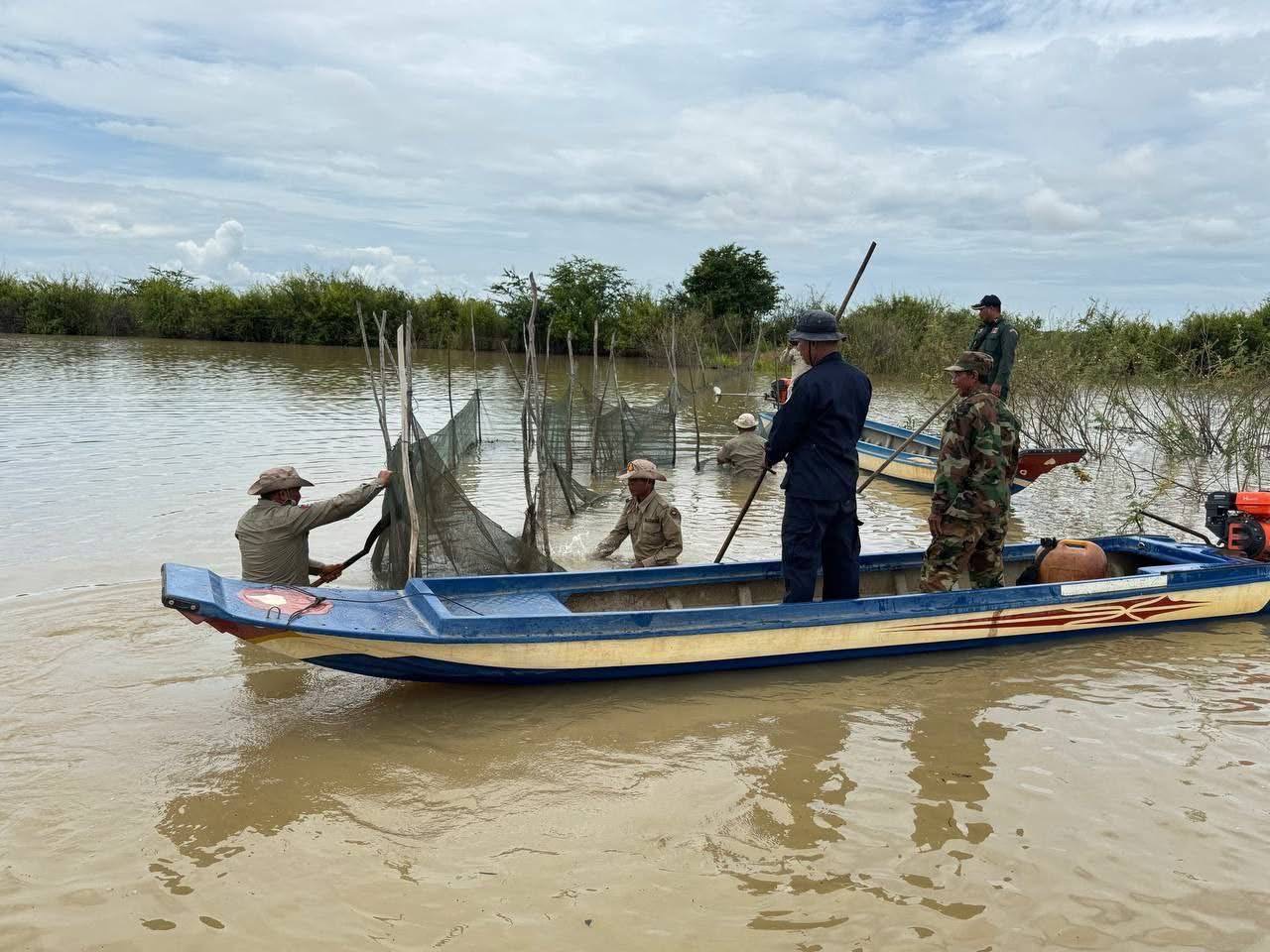 ខេត្តកំពង់ធំ៖ លោក ប៉ែន ផល្លីកា អនុរដ្ឋលេខាធិការ ក្រសួងកសិកម្ម រុក្ខាប្រមាញ់ និងនេសាទតំណាងដ៏ខ្ពង់ខ្ពស់លោករដ្ឋមន្ត្រី ឌិត ទីណា បានដឹកនាំក្រុមការងារជំនាញ រួមមានលោក ប៉ី វិចិត្រ នាយរងអធិការដ្ឋានរដ្ឋបាលជលផលខាងជើងបឹងទន្លេសាប លោក ជិន ស៊ីថា នាយខណ្ឌរដ្ឋបាលជលផលកំពង់ធំ និងសហការី តំបន់ប្រតិបត្តិការសឹករងកំពង់ធំ (យោធភូមិភាគទី៤) និងកម្លាំងចម្រុះទីបញ្ជាការស្រាលប្រចាំការឃុំពាមបាង ស្រុកស្ទោង នៅថ្ងៃទី៤ ខែកញ្ញា ឆ្នាំ២០២៥ បានចេញប្រតិបត្តិការត្រួតពិនិត្យ និងបង្ក្រាបបទល្មើសនេសាទ នៅចំណុចមួយចំនួនមានដូចជា៖ វាលទុង វេហាល បែកឃ្លះ ប្រាំបីមុំ កាប់ចិន ខ្វែងតាសូ និងព្រែកចងខ្លុង ស្ថិតនៅឃុំពាមបាង ស្រុកស្ទោង ខេត្តកំពង់ធំ។