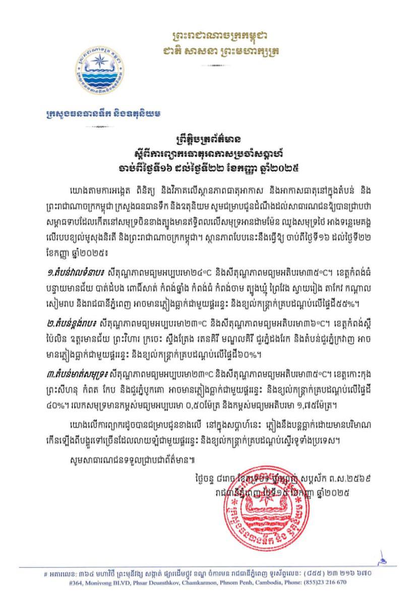 ភ្នំពេញ ៖ នៅល្ងាចថ្ងៃទី១៥ ខែកញ្ញា ឆ្នាំ២០២៥ ក្រសួងធនធានទឹកនិងឧតុនិយម បានបញ្ជាក់ថា, យោងតាមការអង្កេត ពិនិត្យ និងវិភាគលើស្ថានភាពធាតុអាកាស និងអាកាសធាតុនៅក្នុងតំបន់ និង ព្រះរាជាណាចក្រកម្ពុជា ក្រសួងធនធានទឹក និងឧតុនិយម សូមជម្រាបជូនដំណឹងដល់សាធារណជនឱ្យបានជ្រាបថា សម្ពាធទាបដែលកើតនៅសមុទ្រចិនខាងត្បូងមានឥទ្ធិពលលើសមុទ្រអានដាមម៉ែន ឈូងសមុទ្រថៃ អាងទន្លេមេគង្គ លើរបបខ្យល់មូសុងនិរតី និងព្រះរាជាណាចក្រកម្ពុជា។ ស្ថានភាពបែបនេះនឹងធ្វើឱ្យ ចាប់ពីថ្ងៃទី១៦ ដល់ថ្ងៃទី២២ ខែកញ្ញា ឆ្នាំ២០២៥៖