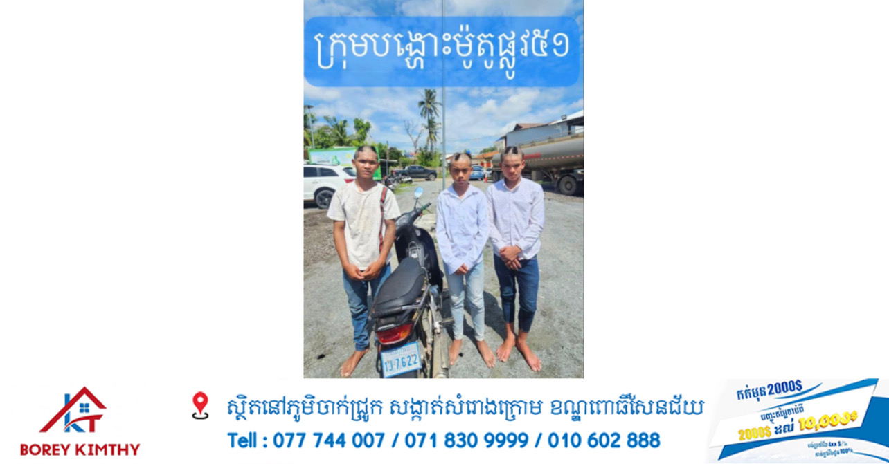 ជាបន្តមកទៀត នៅចំណុចក្នុងបុរី ស៊ីអេស២ (CS2) ស្ថិតក្នុងភូមិត្រពាំងប្រិយ៍ សង្កាត់ក្សេមក្សាន្ត ក្រុងឧដុង្គម៉ែជ័យ ខេត្តកំពង់ស្ពឺ សមត្ថកិច្ចបន្ដឃាត់បាន២នាក់÷ ១-ឈ្មោះ ហ៊ាត សុម៉ាលី ភេទប្រុស អាយុ១៦ឆ្នាំ ជាអ្នកបង្ហោះម៉ូតូនិង២-ឈ្មោះ សុខ ផាន់ណា ភេទប្រុស អាយុ ១៥ឆ្នាំ ជាអ្នកបង្ហោះ រស់នៅភូមិព្រៃទា សង្កាត់ចោមចៅទី២ ខ័ណ្ឌពោធិ៍សែនជ័យ រាជធានី ភ្នំពេញ។