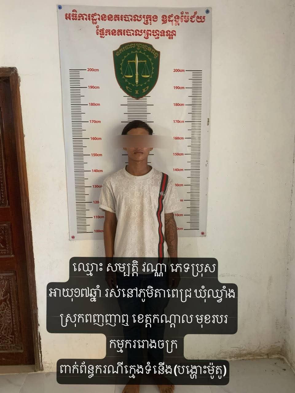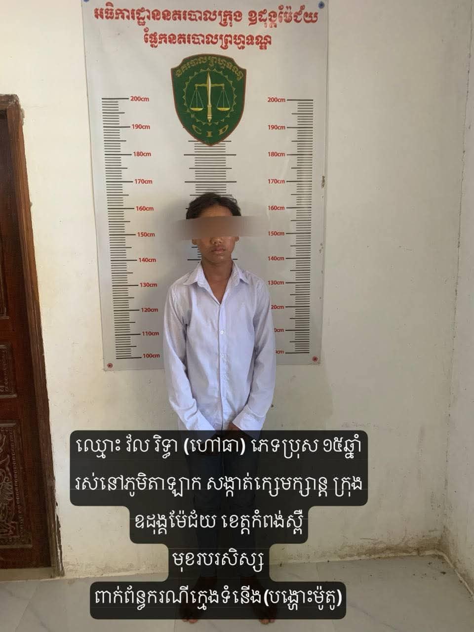 សមត្ថកិច្ចឃាត់មនុស្ស៣នាក់,១-ឈ្មោះ សាំង សុបិណ្ឌ ភេទប្រុស អាយុ១៦ឆ្នាំ រស់នៅភូមិព្រៃពង្រ សង្កាត់ពញ្ញាពន់ ខណ្ឌព្រែកព្នៅ រាជធានីភ្នំពេញ ជាអ្នកបើក,២- ឈ្មោះ សម្បត្តិ វណ្ណា ភេទប្រុស អាយុ១៧ឆ្នាំ រស់នៅភូមិតាពេជ្រ ឃុំឈ្វាំង ស្រុកពញាឮ ខេត្តកណ្តាលអ្នកកជិះពីក្រោយនិង៣-ឈ្មោះ វ័ល រិទ្ធា ភេទប្រុស អាយុ១៥ឆ្នាំ រស់នៅភូមិតាឡាក់ សង្កាត់ក្សេមក្សាន្ត ក្រុងឧដុង្គម៉ែជ័យ ខេត្តកំពង់ស្ពឺ អ្នកជិះពីក្រោយ ។