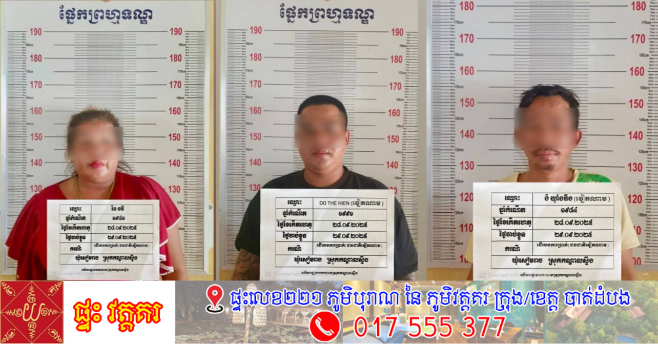 ខេត្តកណ្ដាល÷ជនសង្ស័យ៣នាក់ ដែលក្នុងនោះមានជនជាតិវៀតណាម២នាក់ និងជនជាតិខ្មែរម្នាក់ត្រូវបានកម្លាំងនគរបាលស្រុកកណ្តាលស្ទឹង ខេត្តកណ្ដាលឃាត់ ខ្លួនបានកាលពីថ្ងៃទី២៨ ខែកញ្ញា ឆ្នាំ២០២៥ បន្ទាប់ពីពួកគេធ្វើ សកម្មភាពដើរចងការប្រាក់ (លុយរាប់) ដោយយកសៀវភៅគ្រួសារ និងអត្តសញ្ញាណប័ណ្ណរបស់ប្រជាពលរដ្ឋជាការបញ្ចាំ។ ការឃាត់ខ្លួននេះធ្វើឡើងនៅភូមិសៀមរាប ឃុំសៀមរាប ស្រុកកណ្តាលស្ទឹង ខេត្តកណ្តាល។