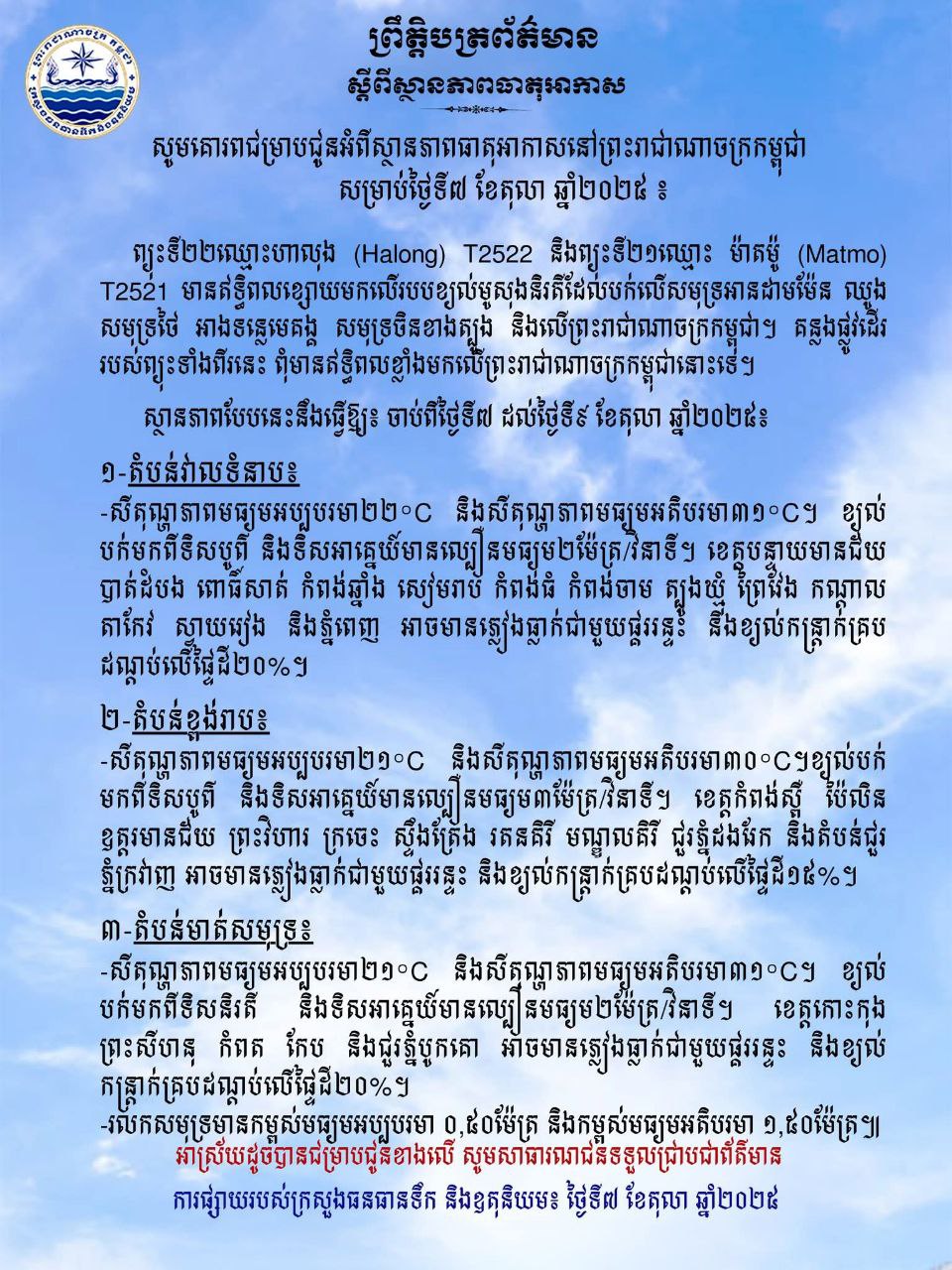 សូមគោរពជម្រាបជូនអំពីស្ថានភាពធាតុអាកាសនៅព្រះរាជាណាចក្រកម្ពុជា សម្រាប់ថ្ងៃទី៧ ខែតុលា ឆ្នាំ២០២៥ ៖