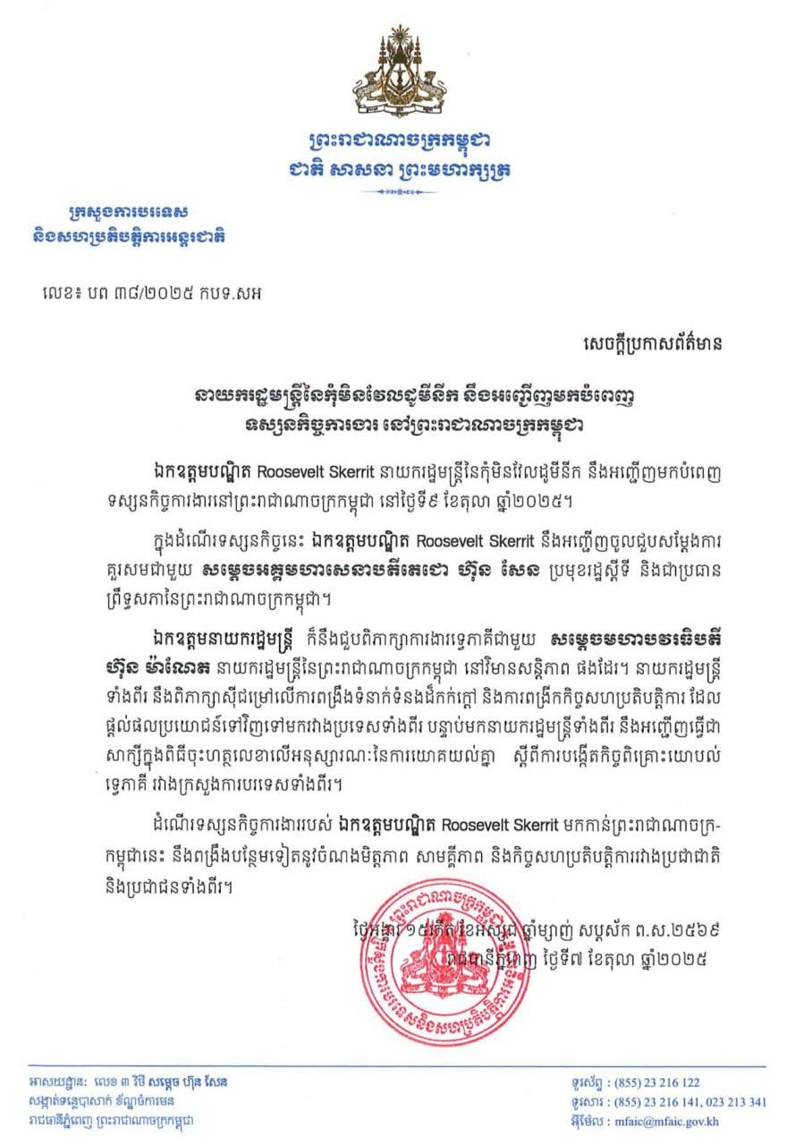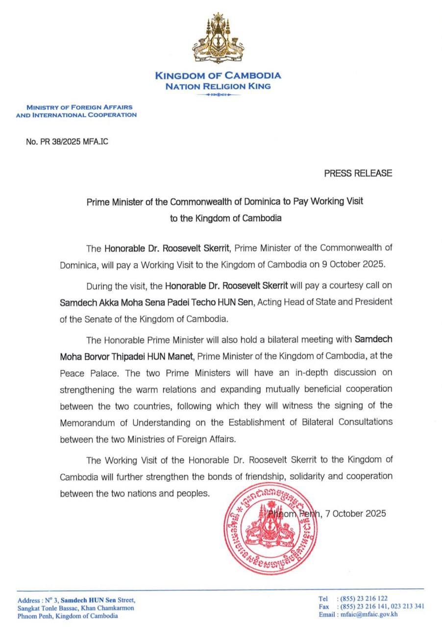 ភ្នំពេញ៖ ក្រសួងការបរទេស និងសហប្រតិបត្តិការអន្តរជាតិ នៅថ្ងៃទី០៧ ខែតុលា ឆ្នាំ២០២៥នេះ បានឱ្យដឹងថា លោកបណ្ឌិត Roosevelt Skerrit នាយករដ្ឋមន្ត្រីនៃកុំមិនដែលដូមីនីក នឹងអញ្ជើញមកបំពេញ ទស្សនកិច្ចការងារនៅព្រះរាជាណាចក្រកម្ពុជា នៅថ្ងៃទី៩ ខែតុលា ឆ្នាំ២០២៥។