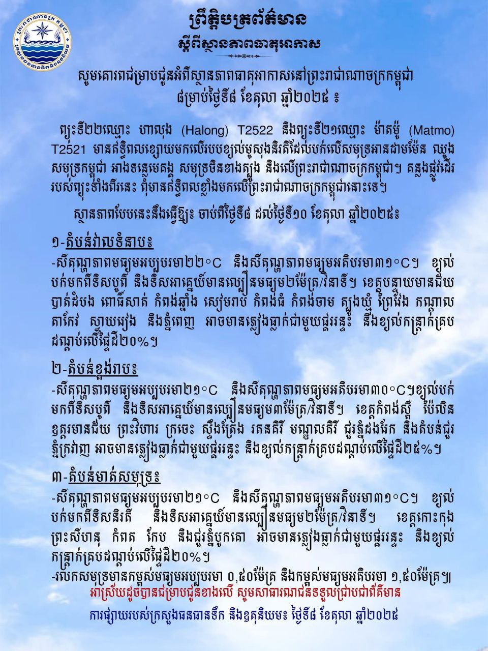 សូមគោរពជម្រាបជូនអំពីស្ថានភាពធាតុអាកាសនៅព្រះរាជាណាចក្រកម្ពុជា ៨ម្រាប់ថ្ងៃទី៨ ខែតុលា ឆ្នាំ២០២៥ ៖