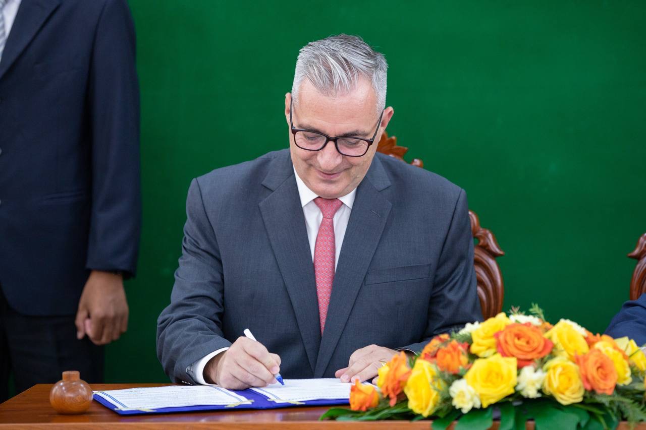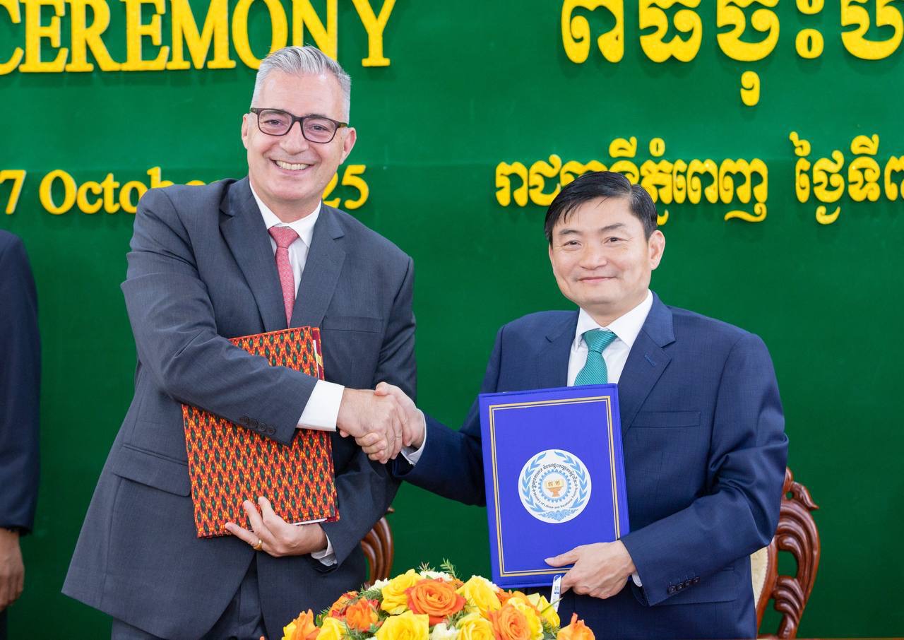 ភ្នំពេញ៖ លោក ហេង សួរ រដ្ឋមន្រ្តីក្រសួងការងារ និងបណ្តុះបណ្តាលវិជ្ជាជីវៈ និងលោក ហ្វ្រាង់ស្វ័រ ស្លូបេលែន នាយកសាលាសណ្ឋាគារ និងទេសចរណ៍ ប៉ូល ឌុយប្រ៊ូល តំណាងអង្គការបណ្តុះបណ្តាល និងវឌ្ឍនភាពកម្ពុជា (ONG Formation Et Progres Cambodge) បានចុះហត្ថលេខាលើកិច្ចព្រមព្រៀងគម្រោង ស្តីពីសាលាសណ្ឋាគារ និងទេសចរណ៍ ប៉ូល ឌុយប្រ៊ូល កាលពីរសៀលថ្ងៃទី៧ ខែតុលា ឆ្នាំ២០២៥ នៅទីស្តីការក្រសួង ដើម្បីជំរុញការបណ្តុះបណ្តាលជំនាញវិជ្ជាជីវៈផ្នែកបដិសណ្ឋារកិច្ច និងទេសចរណ៍។