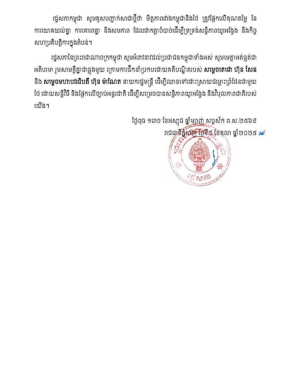 នៅថ្ងៃទី៨ ខែតុលា ឆ្នាំ២០២៥ រដ្ឋសភាកម្ពុជា បានចេញសេចក្តីថ្លែងការណ៍សម្ដែងការសោកស្តាយយ៉ាងខ្លាំងបំផុត និងថ្កោលទោសយ៉ាងដាច់អហង្ការ ទង្វើទុយ៌ស អសីលធម៌ ថោកទាប គ្មានតម្លៃជាមនុស្សរបស់ជនជាតិថៃមួយចំនួនដែលបានវាយប្រហារមកលើ សម្តេចអគ្គមហាសេនាបតីតេជោ ហ៊ុន សែន ប្រមុខរដ្ឋស្តីទី និងជាប្រធានព្រឹទ្ធសភានៃព្រះរាជាណាចក្រកម្ពុជា និងឥស្សរជនកម្ពុជាមួយចំនួនទៀតនាពេលថ្មីៗនេះ។