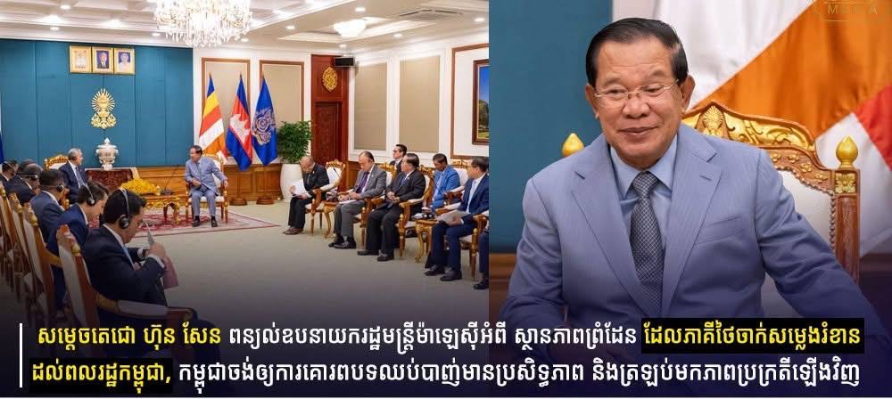 ភ្នំពេញ ៖ សម្ដេចតេជោ ហ៊ុន សែន ប្រធានព្រឹទ្ធសភាកម្ពុជា នៅព្រឹកថ្ងៃទី១៤ ខែតុលា ឆ្នាំ២០២៥នេះ បានពន្យល់ប្រាប់ឧបនាយករដ្ឋមន្ត្រីម៉ាឡេស៊ីអំពី ស្ថានភាពជាក់ស្ដែងដែលភាគីថៃបានចាក់ សម្លេងខ្មោច ឬសម្លេងនានារំខានពលរដ្ឋនៅភូមិជោគជ័យ នៅភូមិព្រៃចាន់រយៈពេល ៤យប់ទៅហើយ ។ សម្ដេចបញ្ជាក់ជាថ្មីថា អ្វីដែលកម្ពជាចង់បានមិនមែនជាការឲ្យសម្ព័ន្ធមិត្តណាមួយទៅថ្កោលទោសថៃនោះទេ ពោលគឺជួយជំរុញឲ្យភាគីទាំងពីរគោរពបទឈប់បាញ់ឲ្យមានប្រសិទ្ធភាព និងវិលរកប្រក្រតីភាពប៉ុណ្ណោះ។