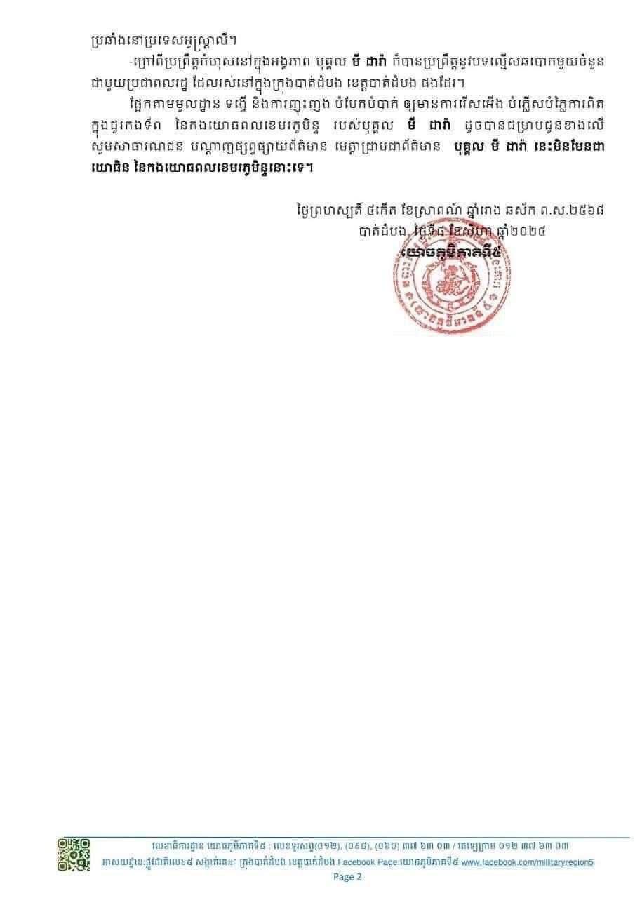 អង្គភាពយោធភូមិភាគទី៥ សូមជម្រាបជូនថា៖ បុគ្គលឈ្មោះ មី ដារ៉ា ពិតជាធ្លាប់ធ្វើជាយោធិន នៅអង្គភាពយោធភូមិភាគទី៥ ពិតប្រាកដមែន ដោយបានចូលបម្រើកងទ័ពនៅឆ្នាំ១៩៩១ ដល់ឆ្នាំ២០២៣ ជាវរសេនីយ៍ នាយរងការិយាល័យអភិវឌ្ឍន៍យោធភូមិភាគទី៥ ក្នុងកំឡុងពេលបំពេញភារកិច្ចក្នុងអង្គភាព បុគ្គលនេះបានប្រព្រឹត្តកំហុសឆ្គងល្មើស និងបទវិន័យទូទៅរបស់កងយោធពលខេមរភូមិន្ទ ជាច្រើនលើក ច្រើនសារ និងបានធ្វើការអប់រំណែនាំពីសំណាក់ នាយការិយាល័យអភិវឌ្ឍន៍ ក៏ដូចជាថ្នាក់ដឹកនាំយោធភូមិ ភាគទី៥ ផងដែរ។