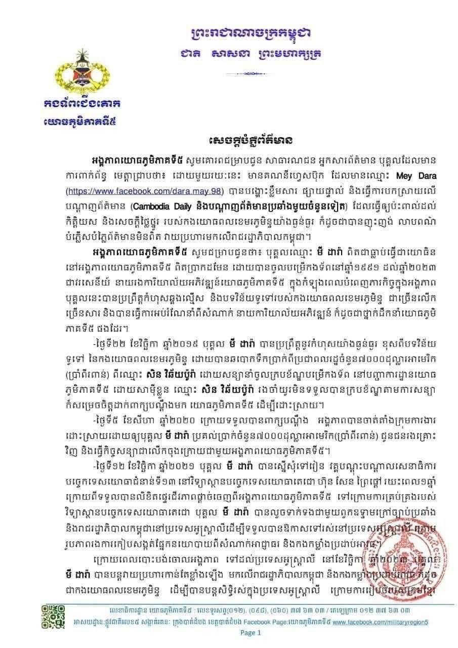 ភ្នំពេញ៖ អង្គភាពយោធភូមិភាគទី៥ សូមគោរពជម្រាបជូន សាធារណជន អ្នកសារព័ត៌មាន បុគ្គលដែលមាន ការពាក់ព័ន្ធ មេត្តាជ្រាបថា៖ ដោយមួយរយៈនេះ មានគណនីហ្វេសប៊ុក ដែលមានឈ្មោះ Mey Dara (https://www.facebook.com/dara.may.98) បានបង្ហោះខ្លឹមសារ ផ្សាយផ្ទាល់ និងធ្វើការបកស្រាយលើ បណ្តាញព័ត៌មាន (Cambodia Daily និងបណ្តាញព័ត៌មានប្រឆាំងមួយចំនួនទៀត) ដែលធ្វើឲ្យប៉ះពាល់ដល់ កិត្តិយស និងសេចក្តីថ្លៃថ្នូរ របស់កងយោធពលខេមរភូមិន្ទយ៉ាងធ្ងន់ធ្ងរ ក៏ដូចជាបានញុះញង់ លាបពណ៌ បំភ្លើសបំភ្លៃព័ត៌មានមិនពិត វាយប្រហារមកលើរាជរដ្ឋាភិបាលកម្ពុជា។