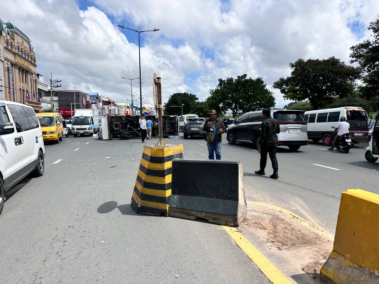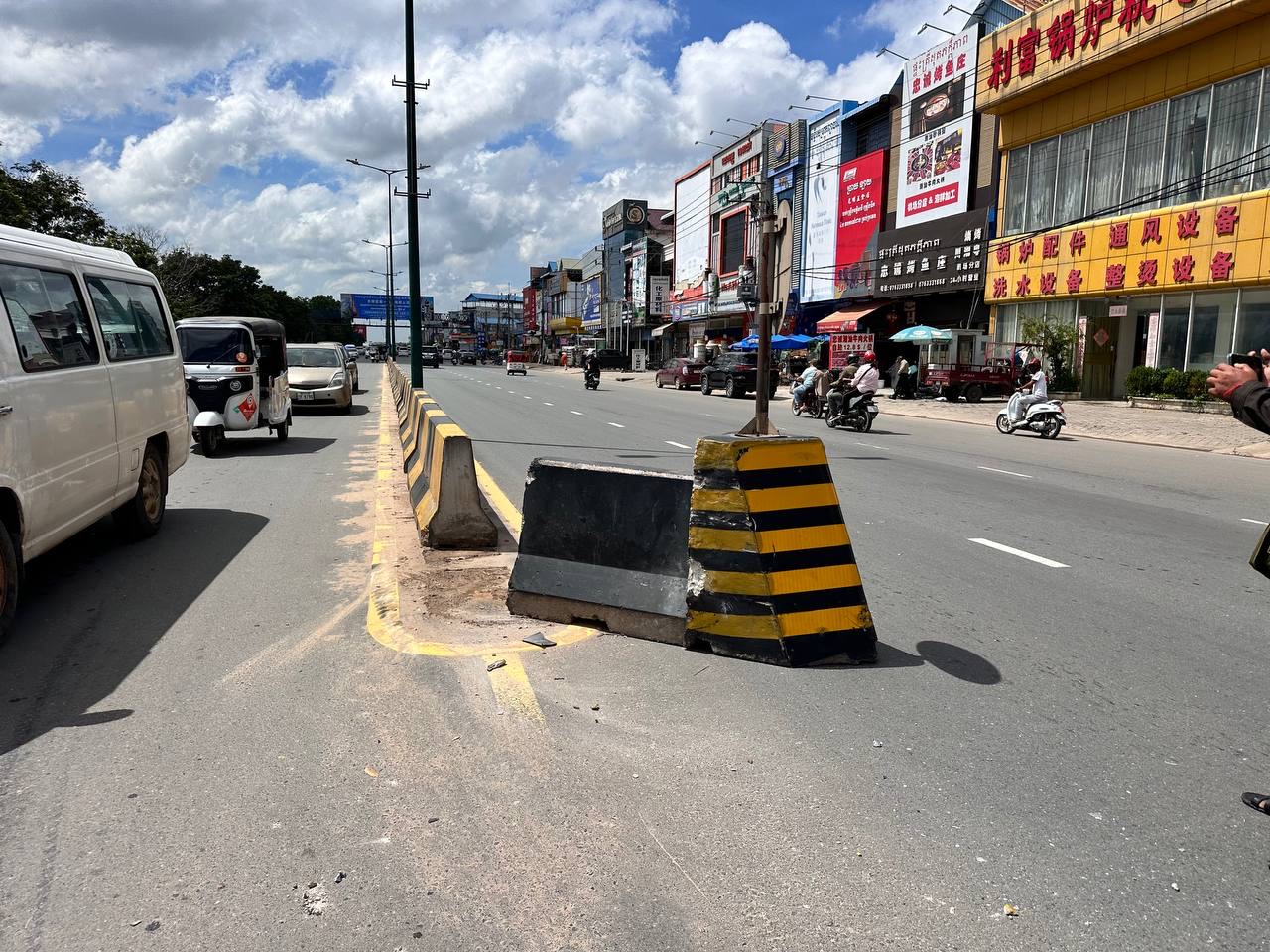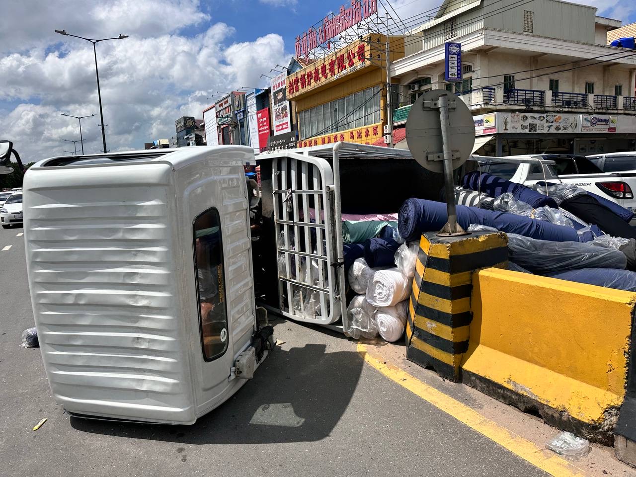 ភ្នំពេញ៖ រថយន្តកូរ៉េដឹកក្រណាត់មួយគ្រឿងបានបេីកលឿនជ្រុលបុករបាំងថ្មពុះចែកទ្រូងផ្លូវបណ្តាលឲ្យរងការខូចខាតចំណែករថយន្តក្រឡាប់ចាក់ក្រណាត់ចោលពេញផ្លូវ។