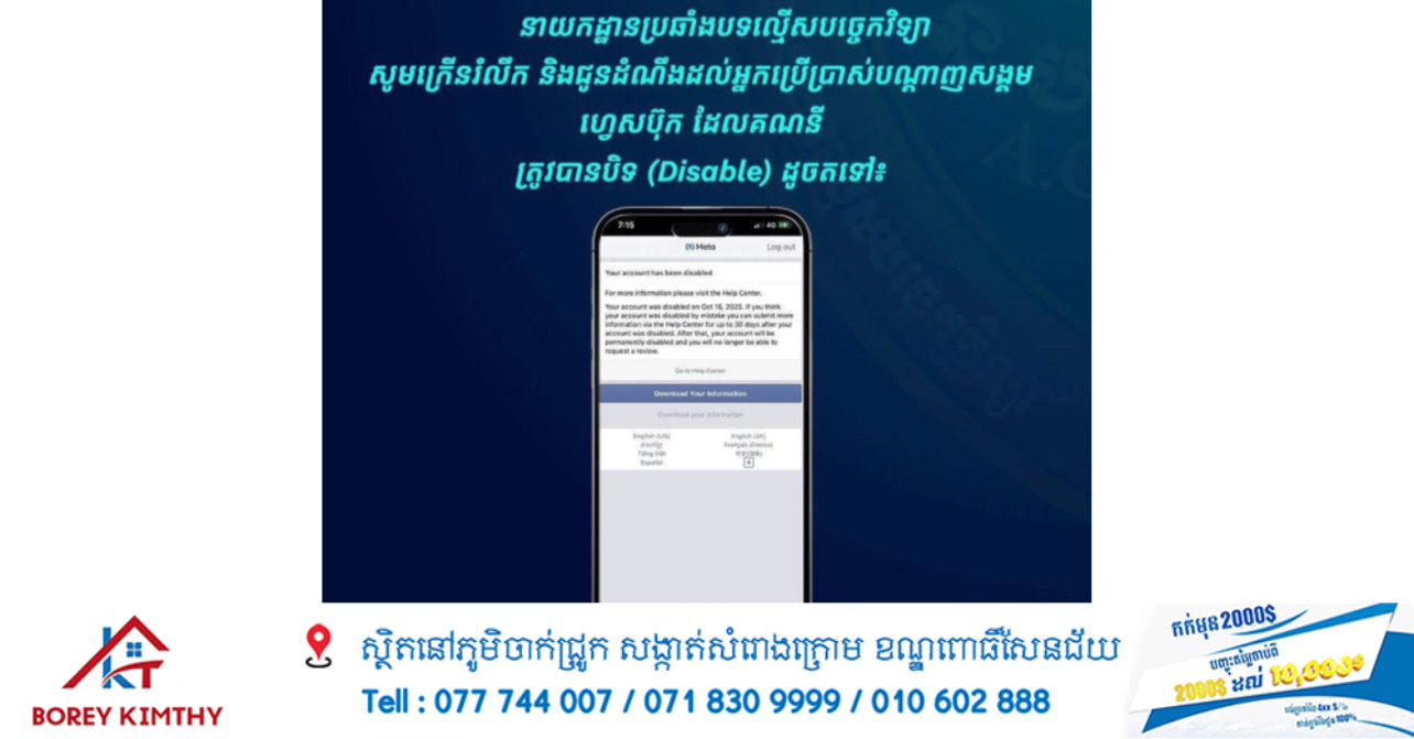 នាយកដ្ឋានប្រឆាំងបទល្មើសបច្ចេកវិទ្យា សូមក្រើនរំលឹក និងជូនដំណឹងដល់អ្នកប្រើប្រាស់បណ្ដាញសង្គមហ្វេសប៊ុក ដែលគណនីត្រូវបានបិទ (Disable) ដូចតទៅ៖