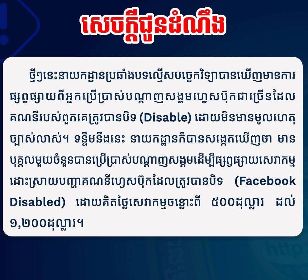 ភ្នំពេញ៖ យោងតាមសេចក្ដីជូនដំណឹងរបស់នាយកដ្ឋានប្រឆាំងបទល្មើសបច្ចេកវិទ្យា នៃក្រសួងមហាផ្ទៃ បានឱ្យដឹងថា ថ្មីៗនេះ នាយកដ្ឋានប្រឆាំងបទល្មើសបច្ចេកវិទ្យា បានឃើញមានការផ្សព្វផ្សាយពីអ្នកប្រើប្រាស់បណ្ដាញសង្គមហ្វេសប៊ុកជាច្រើនដែលគណនីរបស់ពួកគេត្រូវបានបិទ (Disable) ដោយមិនមានមូលហេតុច្បាស់លាស់។ ទន្ទឹមនឹងនេះ នាយកដ្ឋានក៏បានសង្កេតឃើញថា មានបុគ្គលមួយចំនួនបានប្រើប្រាស់បណ្ដាញសង្គមដើម្បីផ្សព្វផ្សាយ សេវាកម្មដោះស្រាយបញ្ហាគណនីហ្វេសប៊ុកដែលត្រូវបានបិទ (Facebook Disabled) ដោយគិតថ្លៃសេវាកម្មចន្លោះពី ៥០០ដុល្លារ ដល់ ១,២០០ដុល្លារ។