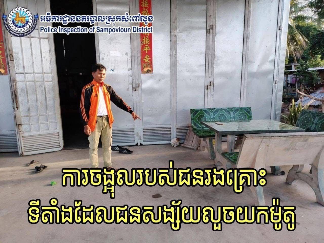 វេលាម៉ោងប្រហែល ៨និង៣០នាទី នៅចំណុចក្រុមទី៨ ភូមិអូរកណ្ដោល ឃុំសន្តិភាព ស្រុកសំពៅលូន ខេត្ត បាត់ដំបង មានករណីអំពើលួច (ម៉ូតូ) កើតឡើង ១ ករណី ទៅលើជនរងគ្រោះឈ្មោះ ឆែម អ៊ីម ភេទប្រុស អាយុ ៤៩ ឆ្នាំ មានទីលំនៅចំណុចកើតហេតុខាងលើ ដែលប្រព្រឹត្តដោយជនសង្ស័យមិនស្គាល់អត្តសញ្ញាណមានគ្នា២ នាក់ ជិះម៉ូតូ ម៉ាកហុងដាឌ្រីម ពណ៌ខ្មៅ គ្មានផ្លាកលេខ បានធ្វើសកម្មភាពលួចយកម៉ូតូ របស់ជនរង គ្រោះ ម៉ាកហុងដាឌ្រីម ពណ៌ខ្មៅ សេរីឆ្នាំ២០១០ ឡើងសេរីបិតតែមឆ្នាំ២០២៥ លេខតួម៉ាស៊ីន ND125ME – 8257420 ផ្លាកលេខ ឧត្តមានជ័យ 1A-5877 ដែលទុកនៅមុខផ្ទះមិនបានដកកូនសោរ ជិះយកទៅបាត់។