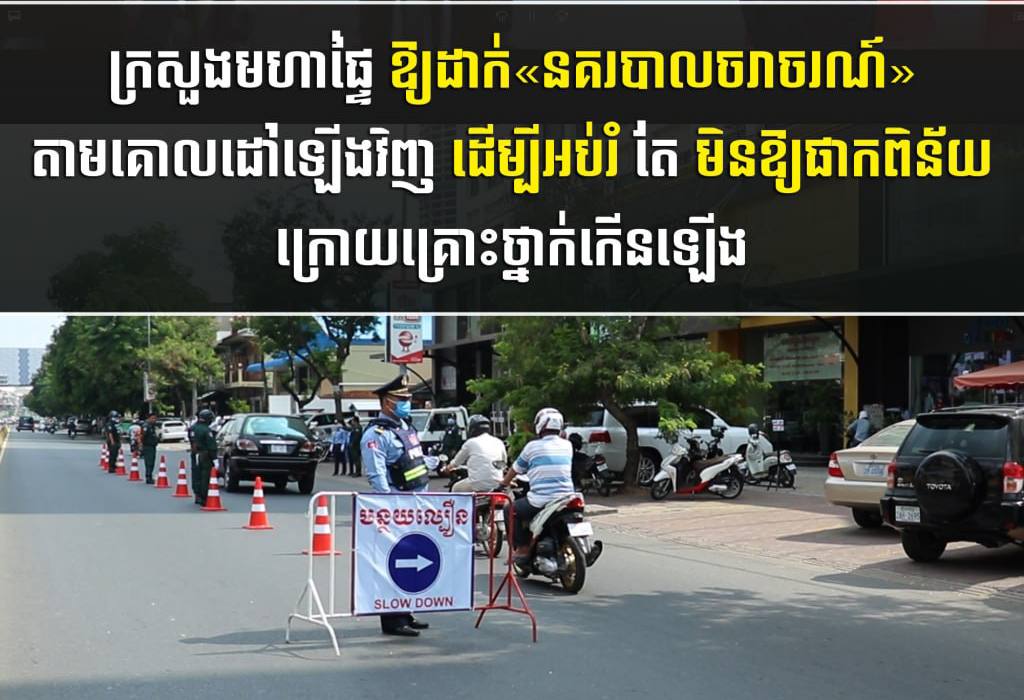 ភ្នំពេញ៖ អ្នកនាំពាក្យរងក្រសួងមហាផ្ទៃ លោក ទូច សុឃៈ បានថ្លែងប្រាប់នៅថ្ងៃទី ២៤ ខែវិច្ឆិកា ឆ្នាំ២០២៥នេះថា ក្រសួងមហាផ្ទៃ បានសម្រេចដាក់មន្ត្រីនគរបាលអនុវត្តច្បាប់ស្តីពីចរាចរណ៍ផ្លូវគោក ទៅតាមគោលដៅឡើងវិញ បន្ទាប់ពីសង្កេតឃើញគ្រោះថ្នាក់ចរាចរណ៍បន្តកើតមានគួរឱ្យព្រួយបារម្ភ។ តែការដាក់ដំណើរការឡើងវិញនេះ ក្នុងគោលដៅចុះអប់រំដល់ប្រជាពលរដ្ឋអ្នកបើកបរ ហើយមិនអនុញ្ញាតឱ្យមន្ត្រីនគរបាលចាប់ផាកពិន័យប្រជាពលរដ្ឋនោះទេ។