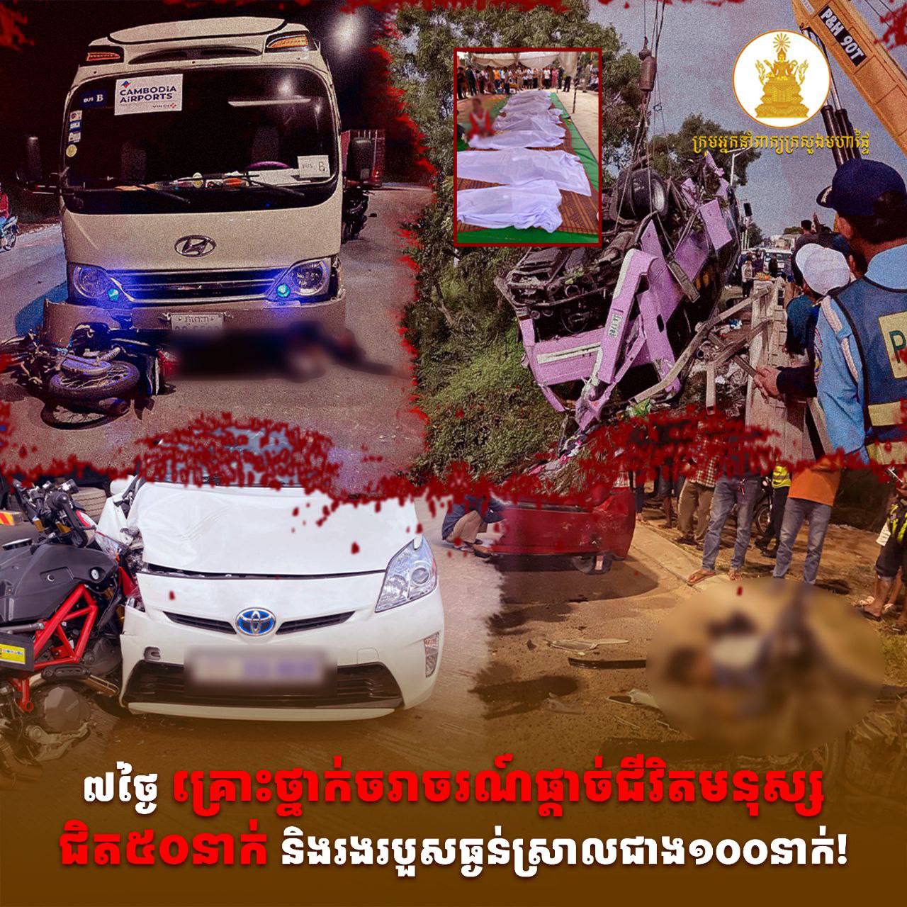 ភ្នំពេញ ៖ រយៈពេលត្រឹមតែ៧ថ្ងៃ គិតចាប់ពីថ្ងៃទី១៧ រហូតដល់ថ្ងៃទី២៣ ខែវិច្ឆិកា ឆ្នាំ២០២៥នេះ ហេតុការណ៍គ្រោះថ្នាក់ចរាចរណ៍ផ្លូវគោកនៅទូទាំងប្រទេស បានបន្តកើតឡើងចំនួន៦៩ករណី បណ្តាលឱ្យមានមនុស្សស្លាប់ចំនួន ៤៤នាក់ និងរងរបួសធ្ងន់ស្រាលចំនួន ១២០នាក់។ នេះបើតាមលោក ទូច សុឃៈ អ្នកនាំពាក្យរងក្រសួងមហាផ្ទៃ។