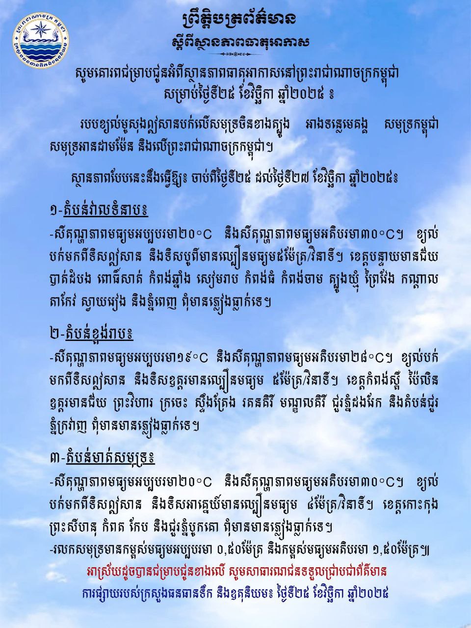 សូមគោរពជម្រាបជូនអំពីស្ថានភាពធាតុអាកាសនៅព្រះរាជាណាចក្រកម្ពុជា សម្រាប់ថ្ងៃទី២៥ ខែវិច្ឆិកា ឆ្នាំ២០២៥ ៖