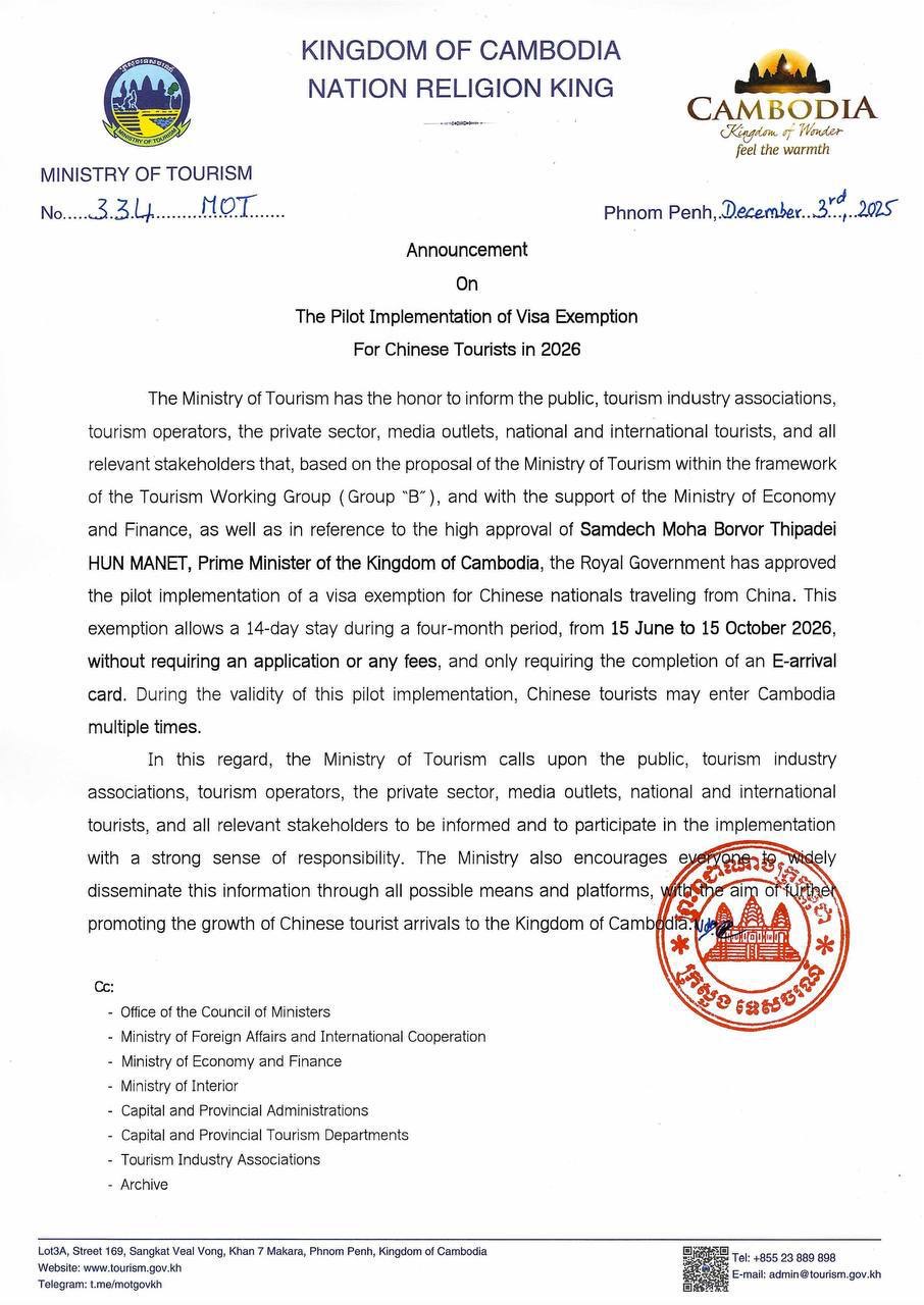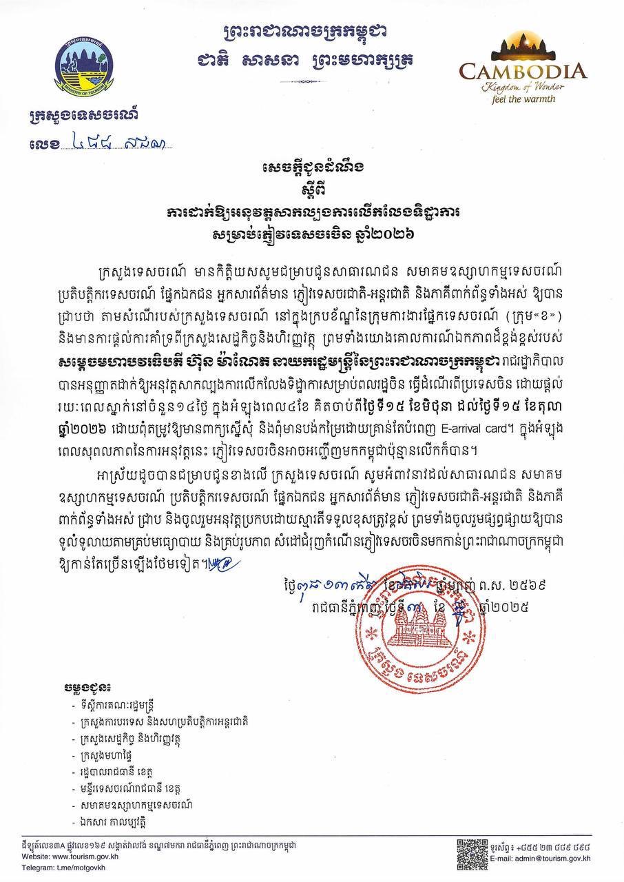 ភ្នំពេញ៖ ក្រសួងទេសចរណ៍ នៅថ្ងៃទី០៣ ខែធ្នូ ឆ្នាំ២០២៥នេះ មានកិត្តិយសសូមជម្រាបជូនសាធារណជន សមាគមឧស្សាហកម្មទេសចរណ៍ ប្រតិបត្តិករទេសចរណ៍ ផ្នែកឯកជន អ្នកសារព័ត៌មាន ភ្ញៀវទេសចរជាតិ-អន្តរជាតិ និងភាគីពាក់ព័ន្ធទាំងអស់ ឱ្យបាន ជ្រាបថា តាមសំណើរបស់ក្រសួងទេសចរណ៍ នៅក្នុងក្របខ័ណ្ឌនៃក្រុមការងារផ្នែកទេសចរណ៍ (ក្រុម«ខ») និងមានការផ្តល់ការគាំទ្រពីក្រសួងសេដ្ឋកិច្ចនិងហិរញ្ញវត្ថុ ព្រមទាំងយោងគោលការណ៍ឯកភាពដ៏ខ្ពង់ខ្ពស់របស់ សម្តេចមហាបវរធិបតី ហ៊ុន ម៉ាណែត នាយករដ្ឋមន្ត្រីនៃព្រះរាជាណាចក្រកម្ពុជា រាជរដ្ឋាភិបាល បានអនុញ្ញាតដាក់ឱ្យអនុវត្តសាកល្បងការលើកលែងទិដ្ឋាការសម្រាប់ពលរដ្ឋចិន ធ្វើដំណើរពីប្រទេសចិន ដោយផ្តល់ រយៈពេលស្នាក់នៅចំនួន១៤ថ្ងៃ ក្នុងអំឡុងពេល៤ខែ គិតចាប់ពីថ្ងៃទី១៥ ខែមិថុនា ដល់ថ្ងៃទី១៥ ខែតុលា ឆ្នាំ២០២៦ ដោយពុំតម្រូវឱ្យមានពាក្យស្នើសុំ និងពុំមានបង់កម្រៃដោយគ្រាន់តែបំពេញ E-arrival card។