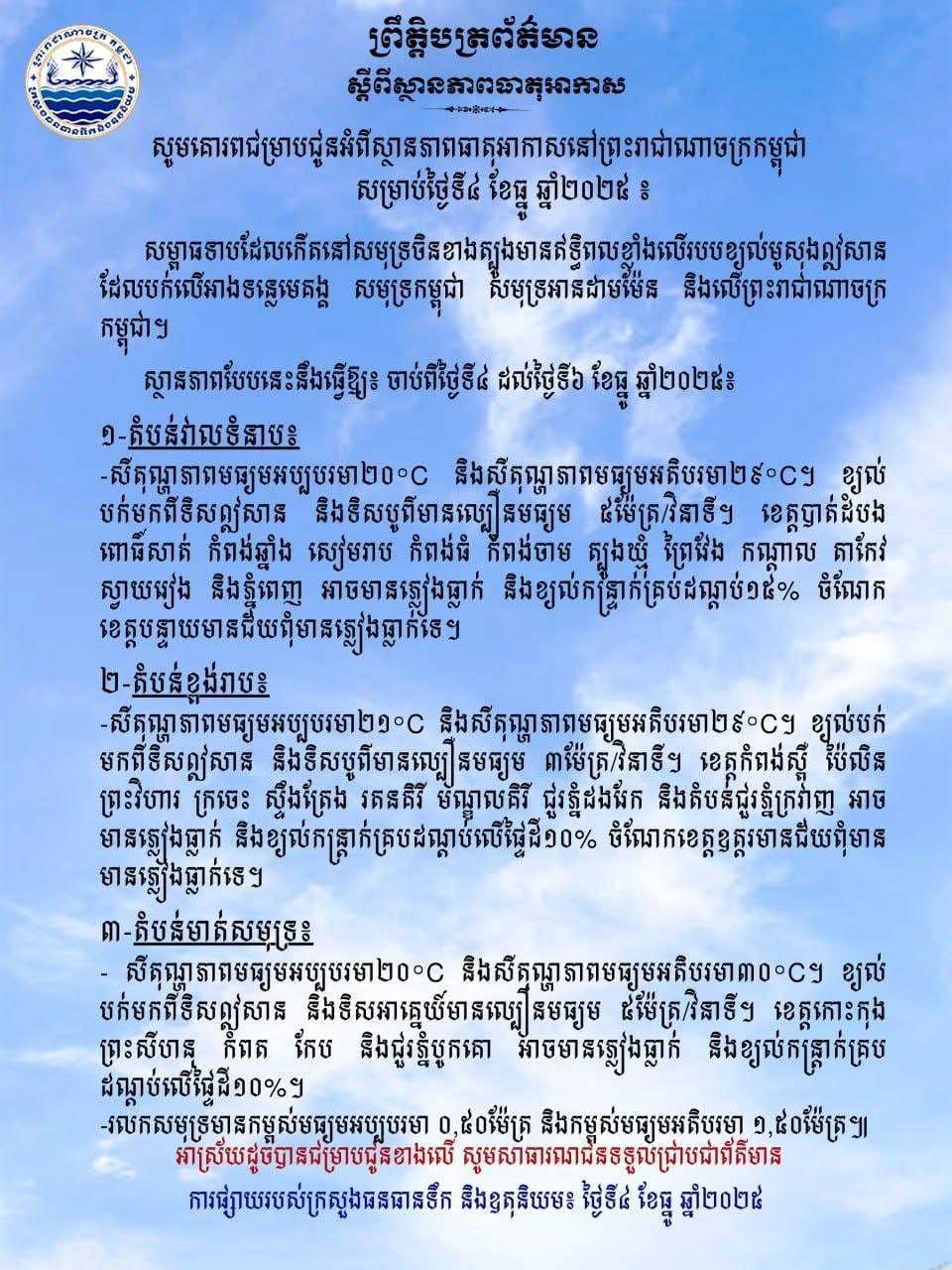 ភ្នំពេញ៖ ក្រសួងធនធានទឹក និងឧតុនិយម នៅព្រឹកថ្ងៃទី០៤ ខែធ្នូ ឆ្នាំ២០២៥នេះ បានចេញសេចក្ដីជូនដំណឹងស្តីពីស្ថានភាពធាតុអាកាសនៅព្រះរាជាណាចក្រកម្ពុជា ខណៈសម្ពាធទាបដែលកើតនៅសមុទ្រចិនខាងត្បូងមានឥទ្ធិពលខ្លាំងលើរបបខ្យល់មូសុងឦសាន ដែលបក់លើអាងទន្លេមេគង្គ សមុទ្រកម្ពុជា សមុទ្រអានដាមម៉ែន និងលើព្រះរាជាណាចក្រ កម្ពុជា។