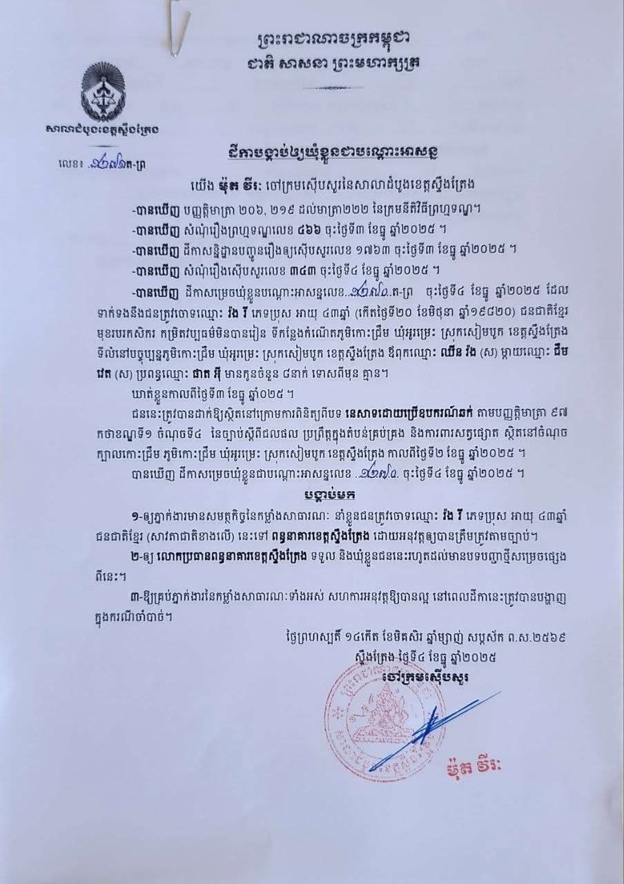 ខេត្តស្ទឹងត្រែង៖ ចៅក្រមស៊ើបសួរសាលាដំបូងខេត្តស្ទឹងត្រែង លោក ម៉ុត វីរៈ បានសម្រេចឱ្យឃុំខ្លួនលោក រ៉ង រី បន្ទាប់ពីបានធ្វើសកម្មភាពនេសាទល្មើសច្បាប់ ដោយប្រើឧបករណ៍ឆក់។