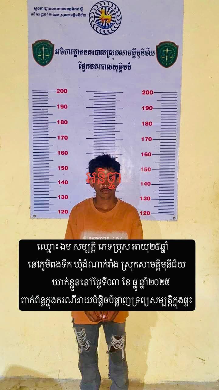ខេត្តកំពង់ស្ពឺ៖ នៅរសៀលថ្ងៃទី០៤ ខែធ្នូឆ្នាំ២០២៥នេះមន្ត្រីនគរបាលនៃអធិការដ្ឋាននគរបាលស្រុកសាមគ្គីមុន្នីជ័យបានឲ្យដឹងថា អនុវត្ដតាមបញ្ជាដឹកនាំរបស់លោកឧត្ដមសេនីយ៍ទោ ឃឹម សុកខៃ ស្នងការនគរបាលខេត្ដកំពង់ស្ពឺ  កំលាំងអធិការដ្ឋាននគរបាលស្រុកសាមគ្គីមុនីជ័យ បានចុះឃាត់បុគ្គលម្នាក់ដែលពោរពេញដោយសារធាតុញៀន ហើយបានគំរាមកំហែងដល់ក្រុមគ្រួសារនិងបំផ្លិចបំផ្លាញទ្រព្យសម្បត្តិនៅក្នុងផ្ទះនៅចំណុចភូមិពងទឹក ឃុំដំណាក់រាំង ស្រុកសាមគ្គីមុនីជ័យ ។
