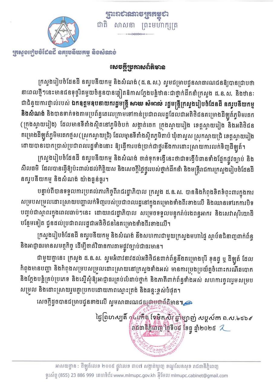 ភ្នំពេញ ៖ ក្រសួងរៀបចំដែនដី នគរូបនីយកម្ម និងសំណង់ (៥. ន. ស.) សូមជម្រាបជូនសាធារណជនឱ្យបានជ្រាបថា នាពេលថ្មីៗនេះមានជនទុច្ចរិតមួយចំនួនបានឆ្លៀតឱកាសក្លែងបន្លំឋានៈជាថ្នាក់ដឹកនាំក្រសួង ដ.ន.ស. និងឋានៈ ជាជំនួយការផ្ទាល់របស់ លោកឧបនាយករដ្ឋមន្ត្រី សាយ សំអាល់ រដ្ឋមន្ត្រីក្រសួងរៀបចំដែនដី នគរូបនីយកម្ម និងសំណង់ និងបានទាក់ទងតាមប្រព័ន្ធតេលេក្រាមទៅកាន់ប្រជាពលរដ្ឋដែលជាអតិថិជនគម្រោងដីឡូត៍ភូមិមរតក (ក្រុងស្វាយរៀង) ដែលមានទីតាំងស្ថិតនៅភូមិចំបក់ សង្កាត់ចេក ក្រុងស្វាយរៀង ខេត្តស្វាយរៀង និងអតិថិជន គម្រោងដីឡូត៍ភូមិមរតកថ្មស(ស្រុកស្វាយជ្រំ) ដែលមានទីតាំងស្ថិតភូមិតាបំ ឃុំតាសួស ស្រុកស្វាយជ្រំ ខេត្តស្វាយរៀង ដោយបានបោកប្រាស់ប្រជាពលរដ្ឋទាំងនោះ ឱ្យធ្វើការបង់ប្រាក់ជាថ្នូរនឹងការដោះស្រាយការលក់ទិញដីឡូត៍។